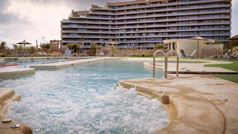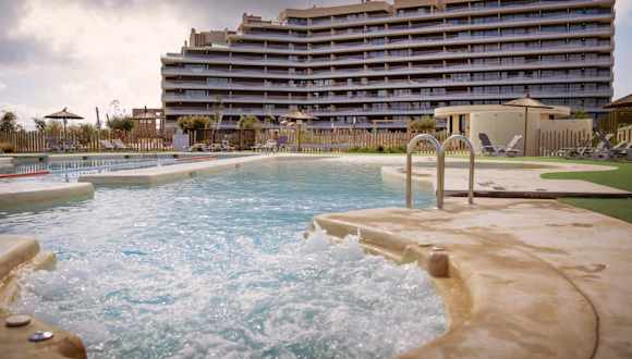Die Zimmer der Unterkunft bieten einen Balkon mit Poolblick, einen Sitzbereich, einen Flachbild-TV und ein eigenes Badezimmer mit einer Dusche.
