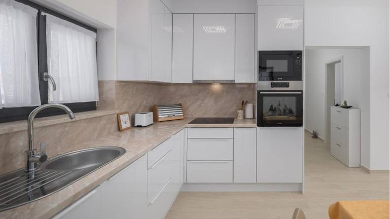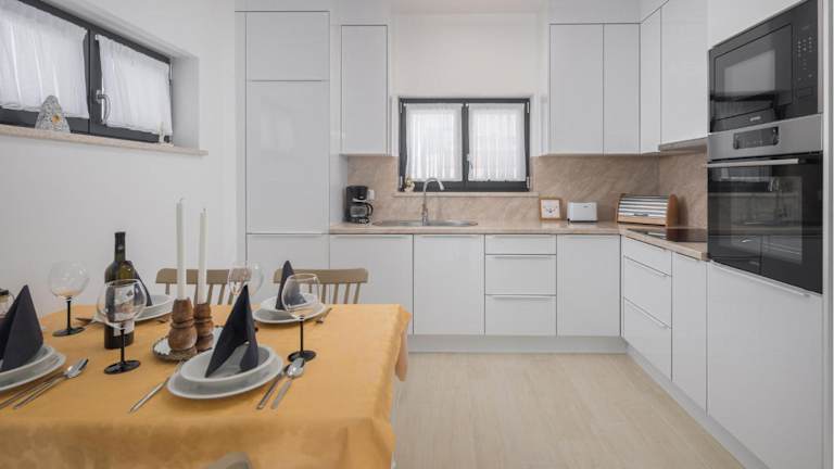 In der gut ausgestatteten Küche der Ferienwohnung mit Kühlschrank und Geschirrspüler können selbst zubereitete Mahlzeiten genossen werden. Es sind keine weiteren Verpflegungsmöglichkeiten angegeben.