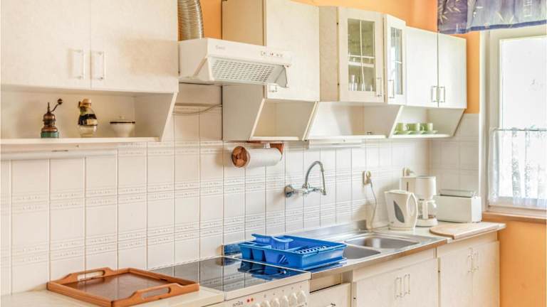 Die voll ausgestattete Küche des Ferienhauses ermöglicht es den Gästen, ihre Mahlzeiten selbst zuzubereiten. Zudem sind Grillmöglichkeiten vorhanden.
