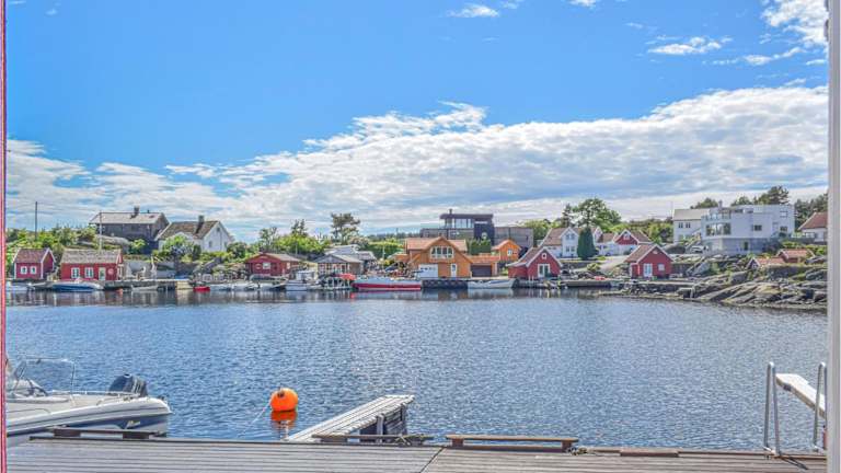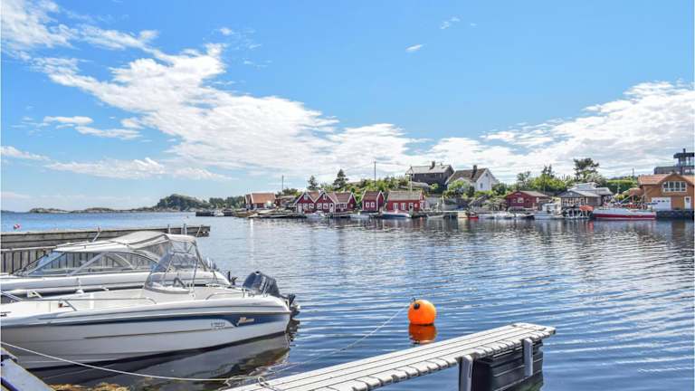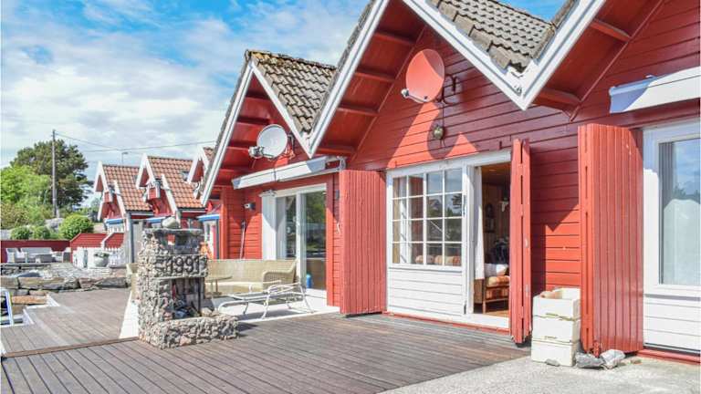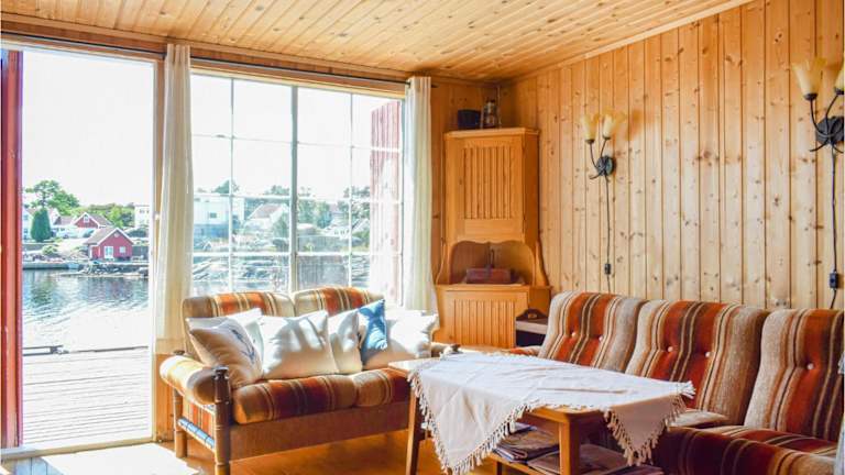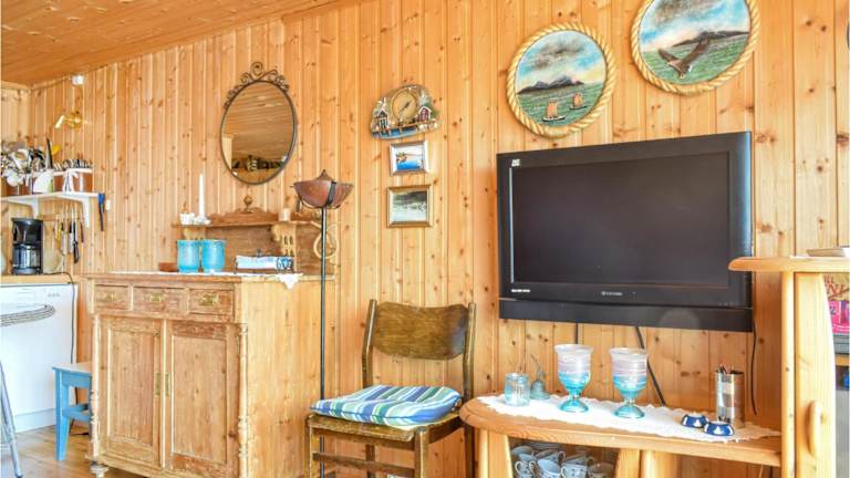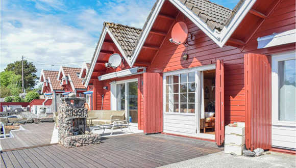 Das Ferienhaus Lovely Home In Søgne hat Blick auf das Meer und bietet ein heimeliges Ambiente mit 1 Schlafzimmer, einem Wohnzimmer und einer voll ausgestatteten Küche, die mit einem Kühlschrank und einem Ofen ausgestattet ist.
