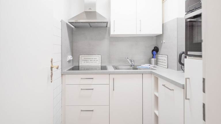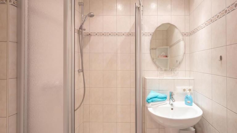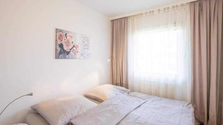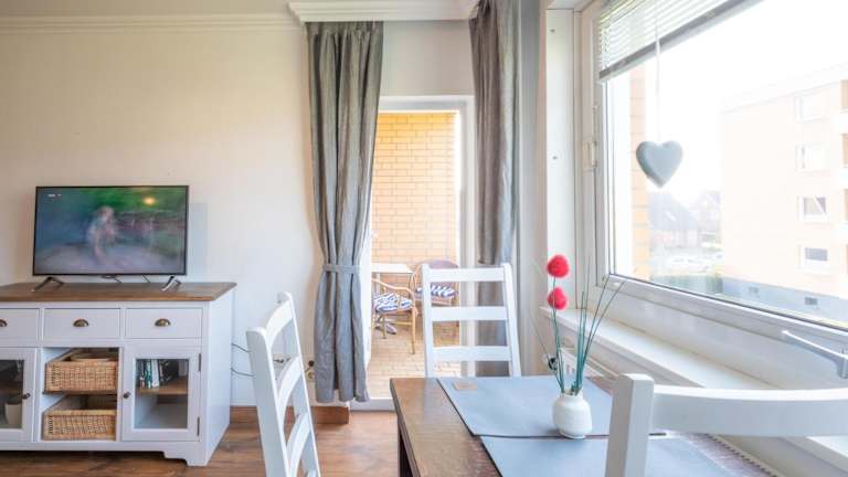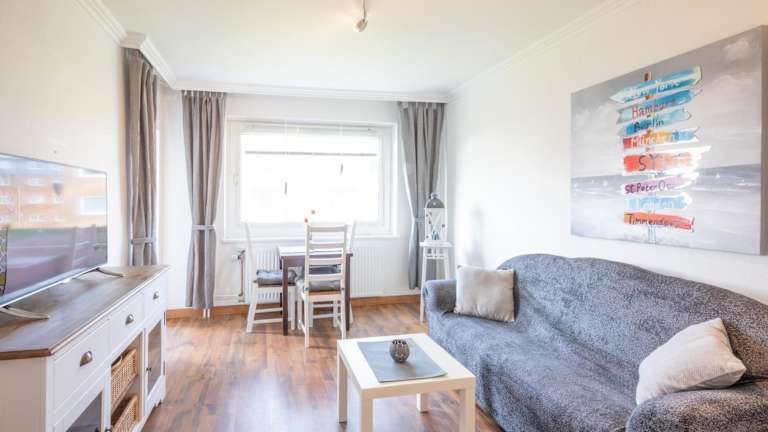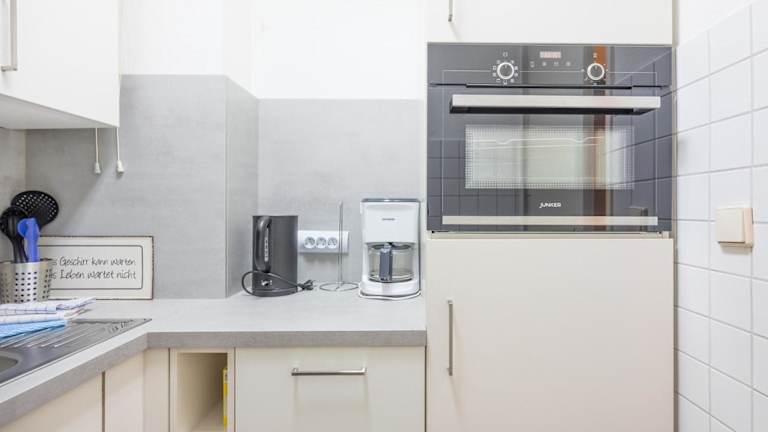 Die Ferienwohnung umfasst ein Schlafzimmer, einen TV sowie eine gut ausgestattete Küche mit Kühlschrank und Geschirrspüler. Ein Badezimmer mit Dusche ist ebenfalls vorhanden.