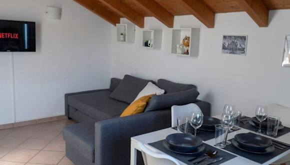 Die Ferienwohnung ist klimatisiert und besteht aus einem Schlafzimmer, einem Wohnbereich mit Flachbild-TV und einem Essbereich. Eine gut ausgestattete Küche mit Kühlschrank ist ebenfalls vorhanden. Gästen stehen Handtücher und Bettwäsche zur Verfügung.