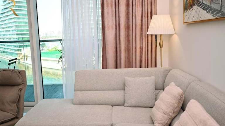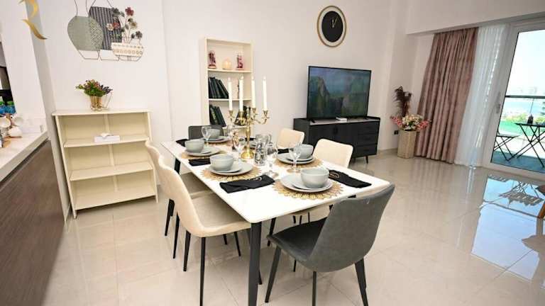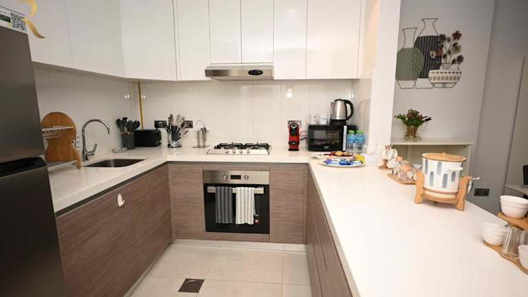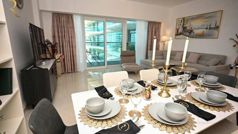 Mariana Luxurious 2BR Apartment Al Raha bietet Übernachtungsmöglichkeiten in einem eleganten und modernen Apartment mit einem Aussenpool, einer Terrasse und einer Bar. Die Unterkunft ist klimatisiert, ideal für Familien und Feriengäste.