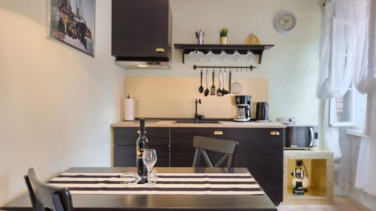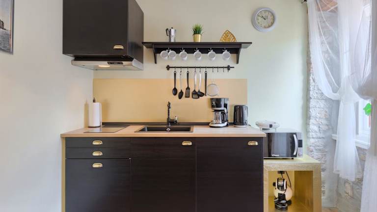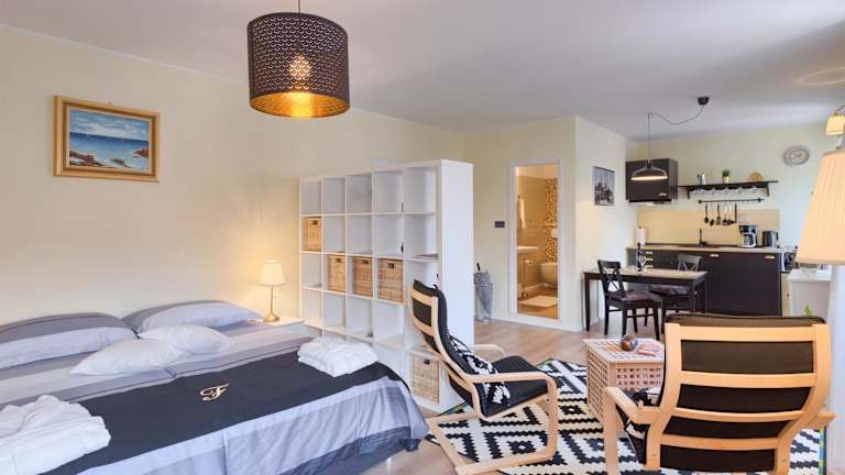 Die Ferienwohnung besteht aus einem Schlafzimmer, einem Wohnzimmer sowie einer voll ausgestatteten Küche mit Kühlschrank und Wasserkocher. Es gibt ein Badezimmer mit Dusche und kostenlosen Pflegeprodukten. Handtücher und Bettwäsche werden angeboten.
