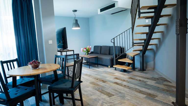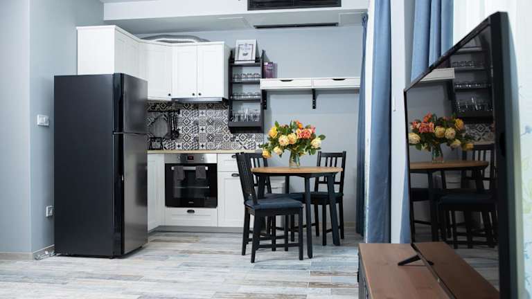 Die Wohneinheiten sind mit Fliesenböden ausgestattet und verfügen über eine voll ausgestattete Küche mit Kühlschrank und Essbereich. Ein Flachbild-TV mit Satellitenkanälen und ein eigenes Badezimmer mit Dusche und Haartrockner sind ebenfalls vorhanden. Für zusätzlichen Komfort sind Handtücher und Bettwäsche gegen Aufpreis erhältlich.