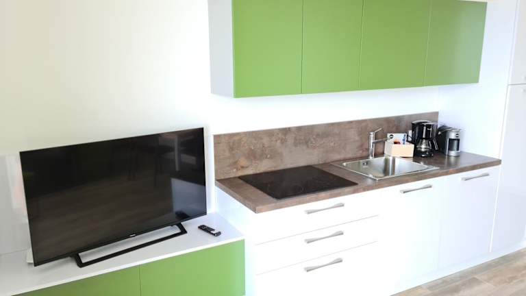 Die Wohnungen sind gut ausgestattet und bieten einen Sitzbereich, einen Satelliten Flachbild-TV sowie eine voll ausgestattete Küchenzeile, die unter anderem einen Kühlschrank, Geschirrspüler, Mikrowelle, Herdplatte, Toaster, Kaffeemaschine und Wasserkocher umfasst. Jedes eigene Badezimmer ist mit einem Bidet und einem Haartrockner ausgestattet.