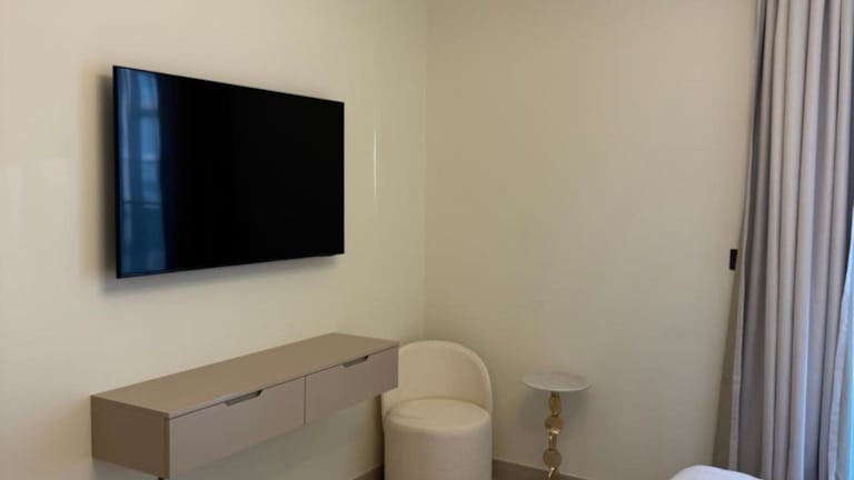 Das Apartment umfasst zwei Schlafzimmer, ein Wohnzimmer und eine voll ausgestattete Küche mit Kühlschrank und Kaffeemaschine. Es gibt insgesamt drei Badezimmer mit Dusche und Bidet, und die Ausstattung umfasst Handtücher sowie Bettwäsche. Alle Zimmer sind klimatisiert und schallisoliert, was zur Bequemlichkeit der Gäste beiträgt.