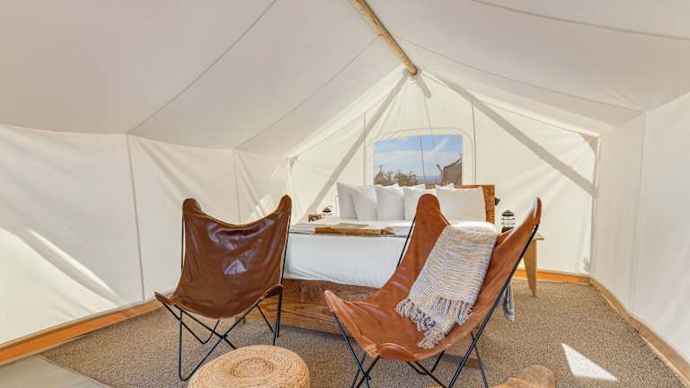 Das Hotel bietet luxuriöse Glamping-Zelte, die mit einem Bett, einem eigenen Bad und einer Sitzecke ausgestattet sind. Sie können zwischen einfachen Zelten mit Gemeinschaftsbad oder Zelt-Lodges mit Dusche, Waschbecken und Loungebereich mit Schlafsofa wählen. Die Zelt-Lodges verfügen über einen eigenen Patio/Veranda mit Liegestühlen, einem Keramikwaschbecken und Wellnessprodukten. Alle Zelte sind mit einer Laterne, Bettwäsche und Handtüchern ausgestattet.