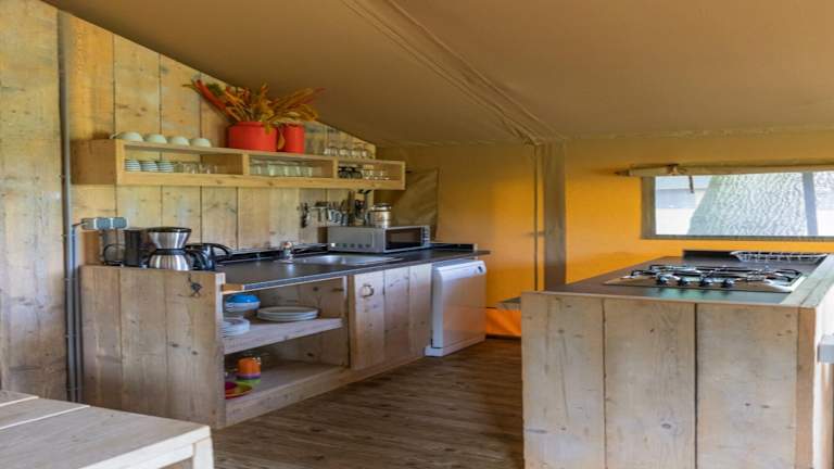 Die Zelt-Lodge ist mit einem Kabel-TV ausgestattet. Die Küche bietet alles Notwendige, einschliesslich Kühlschrank, Geschirrspüler, Mikrowelle und Wasserkocher. Die Unterkunft wird nach den Richtlinien der örtlichen Behörden sauber gehalten, inklusive der Bereitstellung von Bettwäsche und Handtüchern.