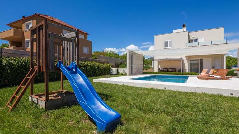 Die Unterkunft bietet Übernachtungsmöglichkeiten mit kostenlosem Wifi, Klimaanlage, einem einladenden Garten und einer gemütlichen Terrasse. Die Villa besticht durch ihren eigenen Aussenpool und einen Kinderspielplatz, der für Familien ideal ist. Zudem stehen den Gästen kostenlos Parkiermöglichkeiten zur Verfügung.