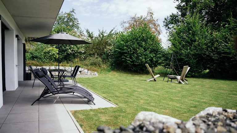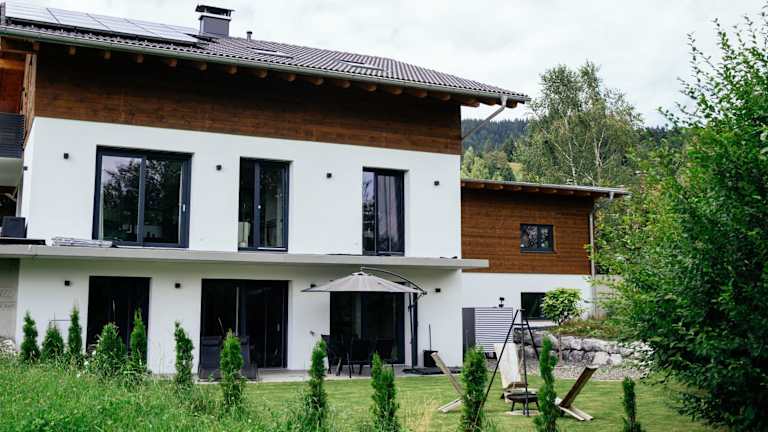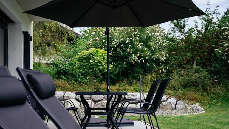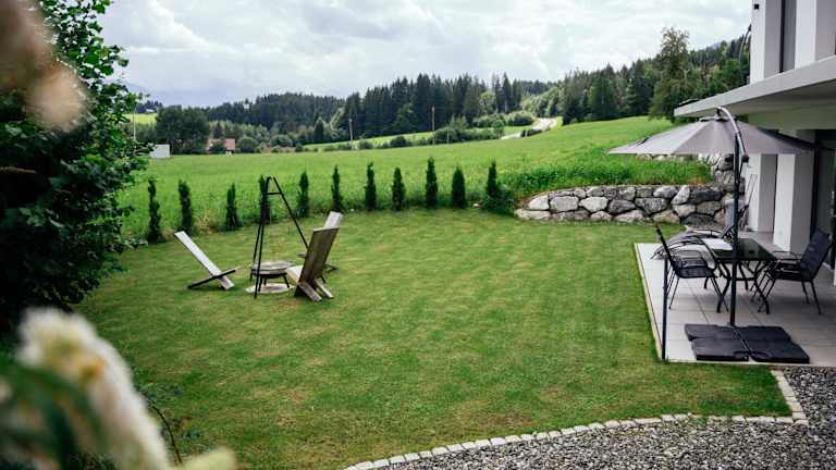 Die Luxusferienwohnung mit Sauna - NEUBAU bietet eine moderne Ausstattung und einen herrlichen Gartenblick. Die Unterkunft ist neu gebaut und beinhaltet eine Terrasse mit Blick auf die Berge.