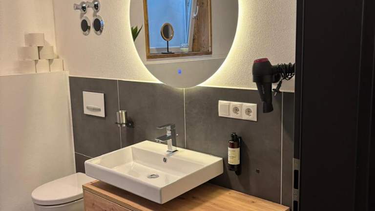 Die Ferienwohnung umfasst ein Schlafzimmer, ein Wohnzimmer, einen Flachbild-TV und eine gut ausgestattete Küchenzeile mit Kühlschrank und Geschirrspüler. Ein Badezimmer mit Dusche gehört ebenfalls zur Ausstattung. Handtücher und Bettwäsche werden bereitgestellt.