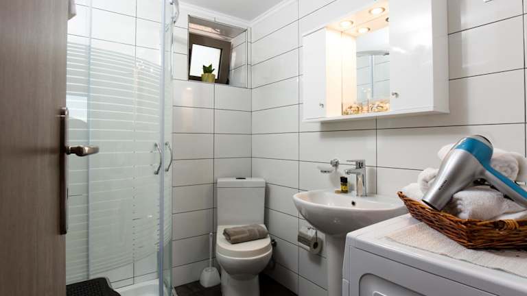 Das Ferienhaus bietet Übernachtungsmöglichkeiten in einem klimatisierten Raum mit zwei Schlafzimmern, einem Wohnzimmer und einer voll ausgestatteten Küche. Die Küche ist mit Kühlschrank und Kaffeemaschine ausgestattet. Die zwei Badezimmer sind mit Dusche und kostenlosen Pflegeprodukten ausgestattet. Handtücher und Bettwäsche werden zur Verfügung gestellt.
