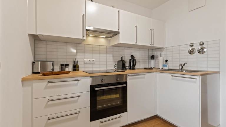 Die Ferienwohnung umfasst 1 Schlafzimmer, eine Küche mit Kühlschrank und Ofen sowie eine Waschmaschine. Ein Badezimmer mit Haartrockner ist ebenfalls vorhanden. Handtücher und Bettwäsche werden bereitgestellt.