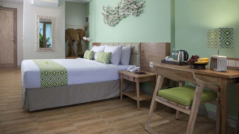 Die Zimmer im Mahagiri Resort Nusa Lembongan sind komfortabel und stilvoll eingerichtet. Jedes Zimmer verfügt über einen Flachbild-TV, einen Safe und ein eigenes Badezimmer mit Hausschuhen und kostenlosen Pflegeprodukten. Einige Zimmer bieten zudem einen gemütlichen Sitzbereich, der zum Entspannen nach einem ereignisreichen Tag einlädt.