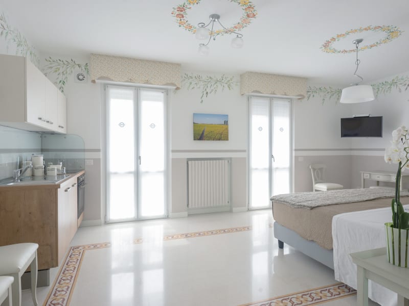 Wir haben uns ausgehend von den Farben der Wände für den Stil des Zimmers Baldo entschieden: Pastellrosa und warmes Grau schaffen eine angenehme, elegante Atmosphäre, zusätzliche Schmuckelemente sind der Kronleuchter und die Wandleuchten im Antik-Silber-Look. Für das Zimmer Carnaroli haben wir uns für ein frisches, duftiges Salbeigrün entschieden und die Wände mit kleinen, handgemalten weißen Blüten veredelt. Die Atmosphäre wird durch die leichten, sanften Farbtöne Weiß und Taubenblau bestimmt und von den Dekorationen um die Kronleuchter aufgenommen: zwei handgemalte Blumenkränze in ziegelrot und grün werden zu dünnen Zweigen, aus denen Naturformen sprießen, die an Ähren erinnern. Auch das Bad ist edel, dafür sorgen die travertinfarbige Verkleidung und die Accessoires.