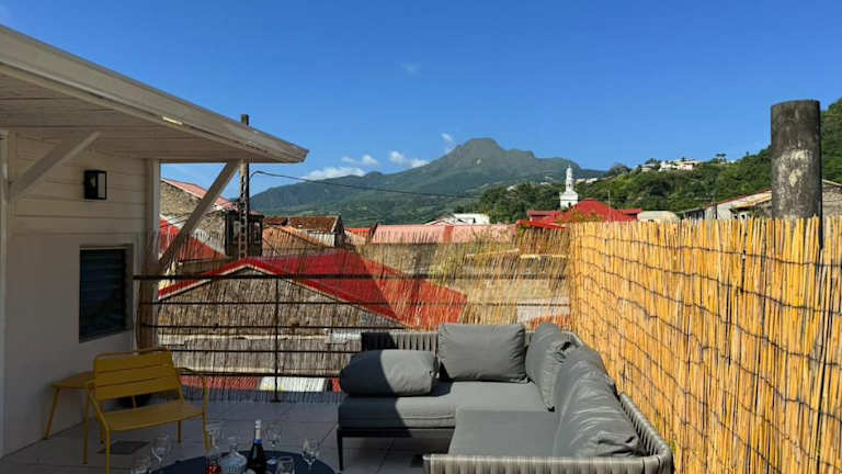 Maison Bernabet - Rooftop avec vue sur la Montagne Pelée hat eine Terrasse und bietet einen Blick auf die Stadt sowie die Montagne Pelée. Es ist eine klimatisierte Unterkunft, die sich ideal für Familien eignet und keinen Platz für Feiern wie Junggesellenabschiede bietet. Die Unterkunft wird von einem privaten Gastgeber geführt.