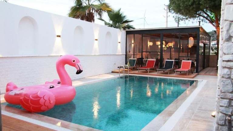 Die Unterkunft befindet sich in Çeşme, in der Nähe des Strands Çiftlikköy, welcher etwa 700 m entfernt ist. Der Strand Pirlanta liegt in etwa 3 km Entfernung. Die Umgebung bietet eine ruhige und entspannende Atmosphäre.