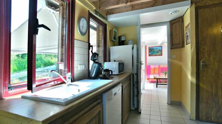 Die voll ausgestattete Küche des Ferienhauses ermöglicht die Zubereitung eigener Mahlzeiten und verfügt über einen Kühlschrank, Geschirrspüler, Ofen, Mikrowelle und Waschmaschine. In der Umgebung befinden sich diverse Restaurants und Einkaufsmöglichkeiten für das leibliche Wohl.
