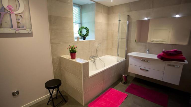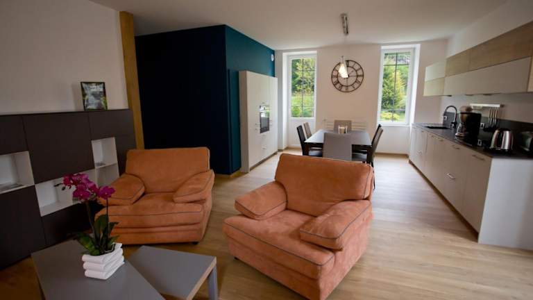 Das Ferienhaus bietet eine Terrasse mit Flussblick, zwei Schlafzimmer, ein Wohnzimmer, einen Satelliten Flachbild-TV sowie eine gut ausgestattete Küche. Es stehen zwei Badezimmer mit Dusche und Badewanne zur Verfügung. Handtücher und Bettwäsche werden bereitgestellt.
