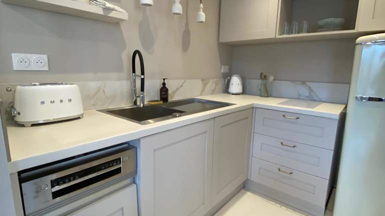 In jeder Wohneinheit steht eine voll ausgestattete Küche mit einem Esstisch zur Verfügung, darunter ein Kühlschrank, ein Geschirrspüler, ein Ofen, eine Kaffeemaschine und ein Wasserkocher.