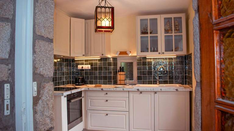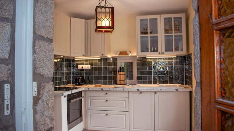 Das Ferienhaus umfasst ein Wohnzimmer mit Sitz- und Essbereich, zwei Schlafzimmer sowie zwei Badezimmer, die mit einer Dusche und einer Badewanne ausgestattet sind. Die Küche verfügt über einen Kühlschrank, Geschirrspüler und Ofen. Zur Ausstattung gehören außerdem ein Blu-ray-Player sowie das Angebot von Handtüchern und Bettwäsche.