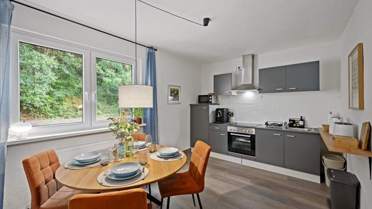 Die Ferienwohnung verfügt über eine voll ausgestattete Küche, die einen Kühlschrank und einen Geschirrspüler beinhaltet. Verpflegungsmöglichkeiten sind innerhalb der Wohnung gegeben, da die Gäste selbst kochen können. Frühstücksangebote sind in der Beschreibung nicht erwähnt.
