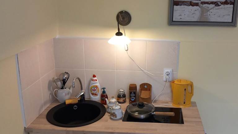 Die Ferienwohnung ist mit einer Küche ausgestattet, die einen Kühlschrank, eine Mikrowelle, eine Herdplatte, eine Kaffeemaschine und einen Wasserkocher umfasst. Ein Restaurant ist ebenfalls Teil der Unterkunft.