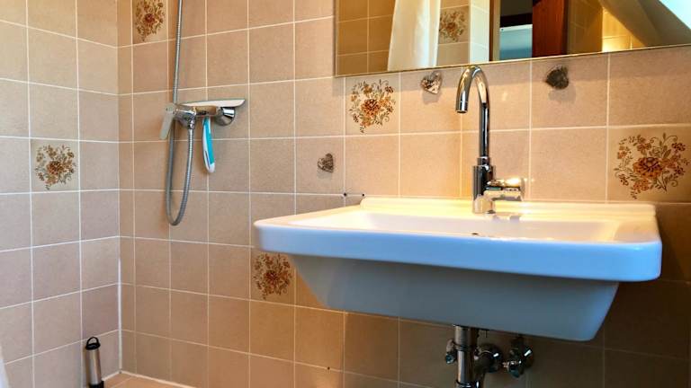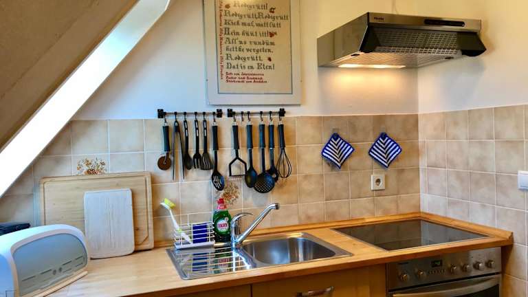Die Ferienwohnung umfasst ein Schlafzimmer und ein Badezimmer mit einer Dusche. Die voll ausgestattete Küche ist mit einem Kühlschrank und einem Ofen versehen. Handtücher und Bettwäsche werden bereitgestellt.