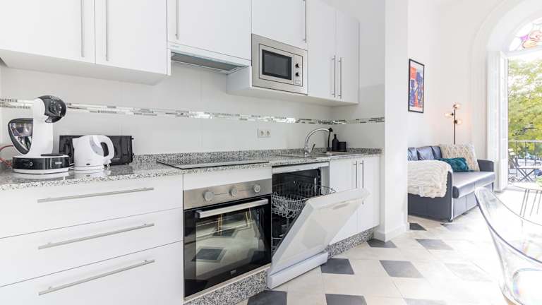 Eine voll ausgestattete Küche steht den Gästen zur Verfügung, die einen Kühlschrank, Geschirrspüler, Mikrowelle, Ofen und Herdplatte umfasst. Zudem gibt es eine Kaffeemaschine und einen Wasserkocher und die Möglichkeit, eigene Mahlzeiten zuzubereiten.
