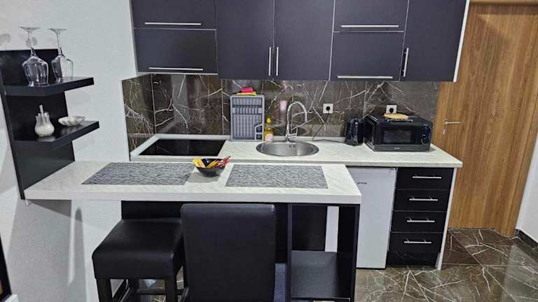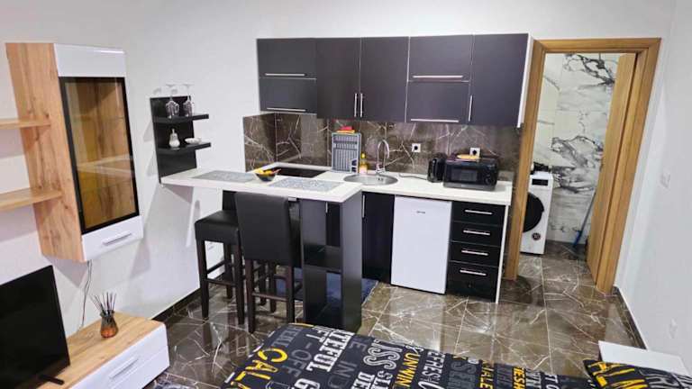 Die Unterkunft verfügt über eine Küchenzeile mit einem Kühlschrank, einem Ofen und einer Mikrowelle, wo die Gäste ihre eigenen Mahlzeiten zubereiten können. Es sind keine spezifischen Verpflegungsmöglichkeiten aufgeführt.