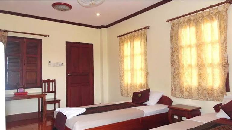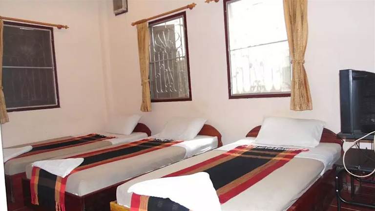 Ruhiges Gästehaus mit Nebengebäude. Liegt in sehr ruhigem Seitenweg nur 10 Gehminuten zum Stadtzentrum. Haupthaus hat die Zimmer mit Balkon und Aussicht auf Fluss Nam Khan und Palmen. An der Rezeption gibt es jederzeit Kaffee und Bananen. Gute und preiswerte Restaurants in naher Umgebung. Während das Haupthaus freundliche, helle Zimmer hat, sind die Zimmer im zurückgesetzten Nebenhaus billiger, aber auch etwas düster und ohne Aussicht. Personal ist sehr freundlich und hilfsbereit. Trotz Flussnähe hatte ich keine…