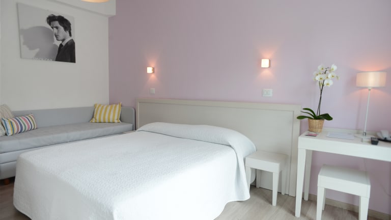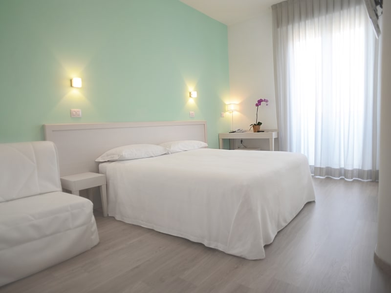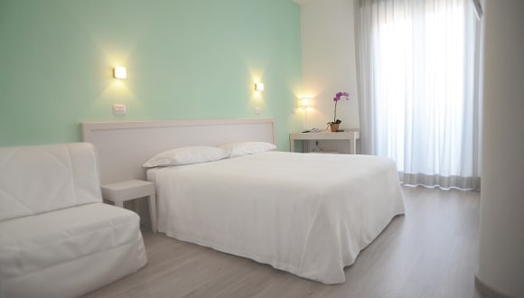 Die klimatisierten Zimmer sind hell eingerichtet und verfügen über einen Flachbild-TV mit Sky-Kanälen. Die meisten Zimmer besitzen einen Balkon, einige davon mit Blick auf die Adria. Im eigenen Badezimmer befinden sich kostenfreie Pflegeprodukte und ein Haartrockner.