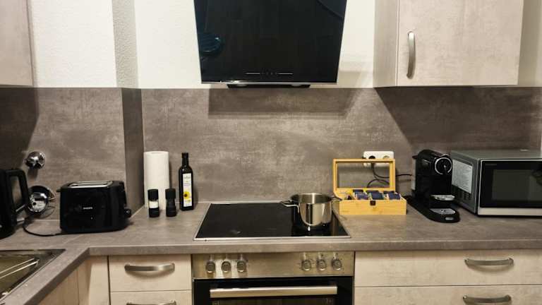 In der Ferienwohnung befindet sich eine voll ausgestattete Küche mit Kühlschrank und Kaffeemaschine, die die Zubereitung eigener Mahlzeiten ermöglicht. Es sind jedoch keine spezifischen Angaben zu Verpflegungsmöglichkeiten vorhanden.