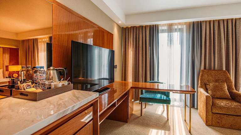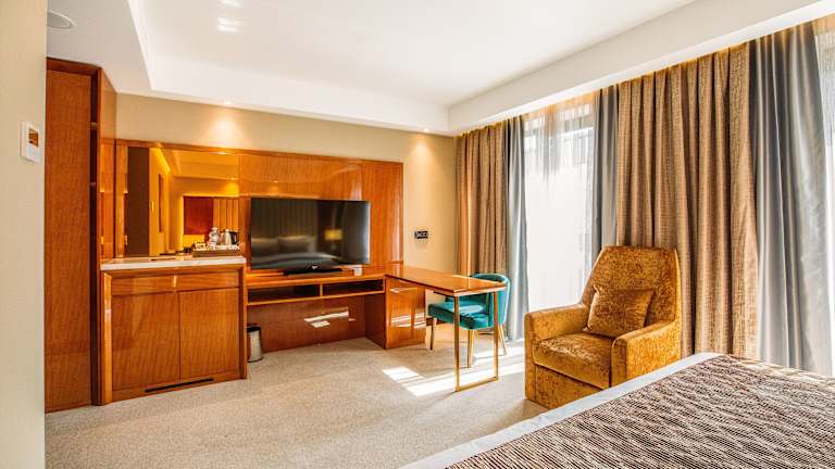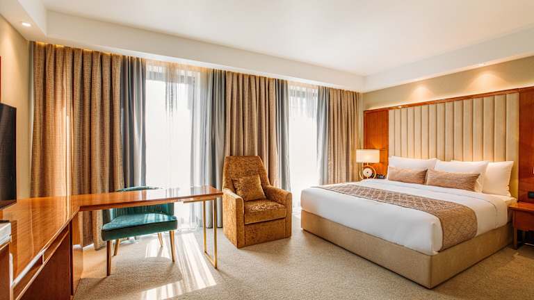 Die Zimmer des Hotels sind mit Teppichböden ausgestattet und bieten ein Queensize-Bett oder ein Kingsize-Bett. Zur weiteren Ausstattungen gehören ein Safe, eine Minibar, ein Wasserkocher sowie eine Tee-/Kaffeemaschine. Die Badezimmer verfügen über eine Dusche, Kosmetikartikel, einen Kosmetikspiegel, Bademäntel und Hausschuhe. Es stehen auch rollstuhlgerechte Zimmer zur Verfügung. Einige Zimmer sind als Familien-, Nichtraucher- oder Raucherzimmer buchbar.