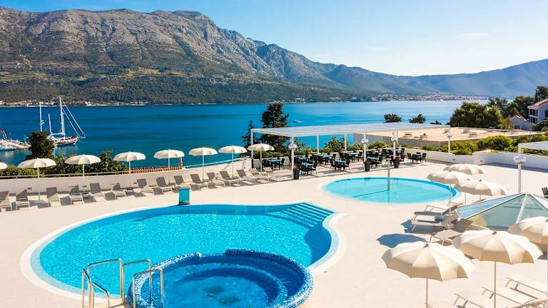 Korčula zum Greifen nah. Marko Polo Maradiso Hotel by Aminess bringt Ihnen Korčula zum Greifen nah. Der historische Stadtkern ist nur wenige Gehminuten entfernt, die Strände liegen noch näher. Und wenn Sie müde oder einfach nur entspannt sind – der Pool auf der Terrasse steht immer bereit, umgeben von Liegen und Sonnenschirmen. Ziehen Sie die Schuhe aus, genießen Sie die Begrüßungssüßigkeit, atmen Sie tief durch. Ihr Urlaub hat begonnen.