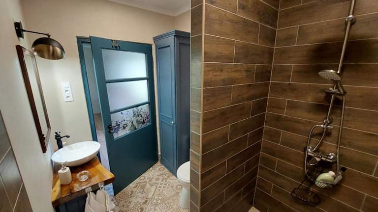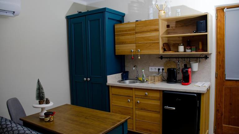 Die Ferienwohnung verfügt über ein Schlafzimmer, eine gut ausgestattete Küchenzeile mit einem Essbereich sowie ein Badezimmer mit Dusche. Handtücher und Bettwäsche werden bereitgestellt. Die Unterkunft ist klimatisiert.