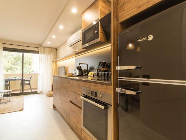 In der Unterkunft ist die Verwendung des voll ausgestatteten Küchenbereichs möglich, wo sich Kühlschrank, Ofen, Mikrowelle, Kaffeemaschine und Wasserkocher befinden. Zudem besteht die Möglichkeit zur Essenslieferung in die Unterkunft.