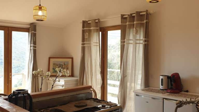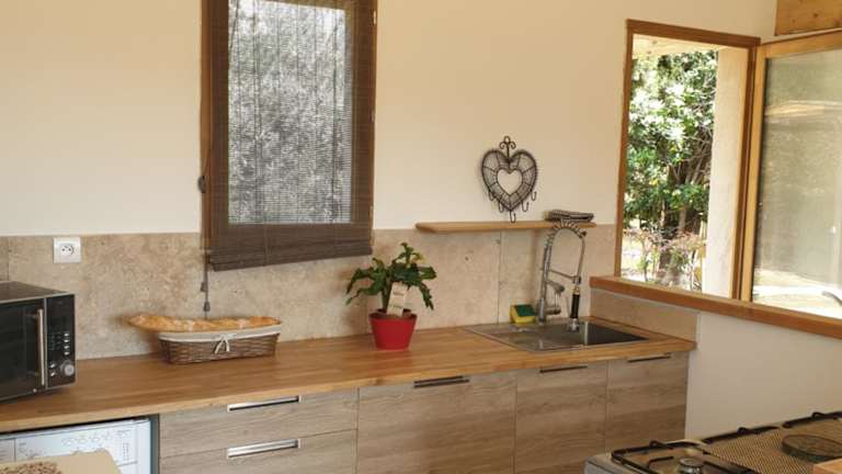 Das Ferienhaus bietet ein Schlafzimmer, ein Wohnzimmer und eine voll ausgestattete Küche mit Kühlschrank und Kaffeemaschine. Die Bequemlichkeit wird durch Klimaanlage, ein Badezimmer mit Dusche und Haartrockner, sowie die Bereitstellung von Handtüchern und Bettwäsche ergänzt.