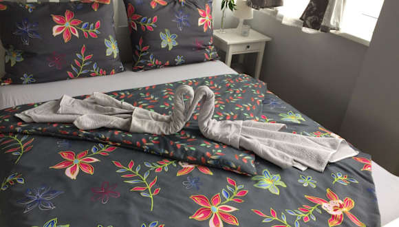 Die Ferienwohnung verfügt über zwei Schlafzimmer und eine gut ausgestattete Küche mit Kühlschrank und Geschirrspüler. Ein Flachbild-TV mit Kabelkanälen ist ebenfalls vorhanden.