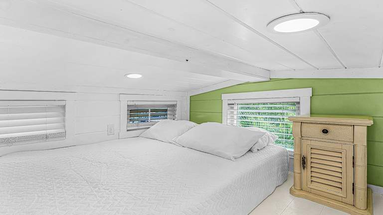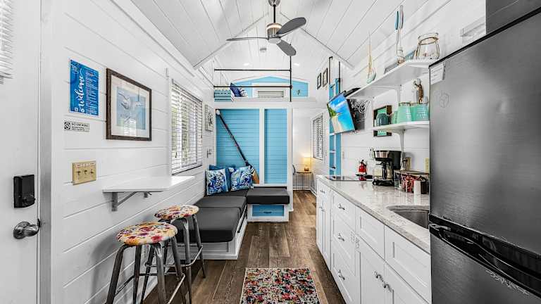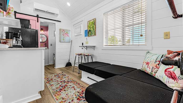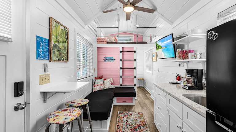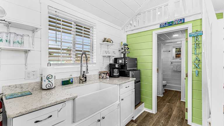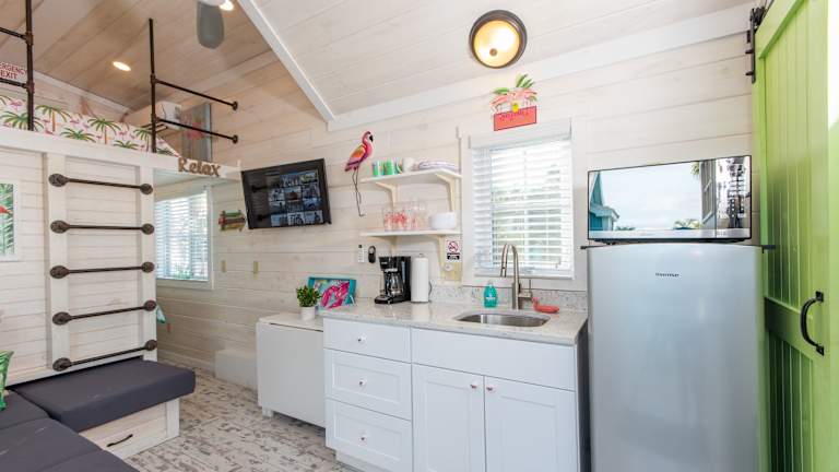 Die Unterkunft im Matlacha Tiny Village besteht aus einem Ferienhaus mit Meerblick. Das Ferienhaus verfügt über eine Terrasse, auf der Sie die schöne Aussicht genießen können. Im Inneren finden Sie einen gemütlichen Sitzbereich und einen Flachbild-TV. Die voll ausgestattete Küchenzeile bietet alles, was Sie für die Zubereitung Ihrer Mahlzeiten benötigen, einschließlich eines Kühlschranks, einer Mikrowelle, eines Kochfelds und einer Kaffeemaschine. Das private Badezimmer ist mit einer Dusche ausgestattet.