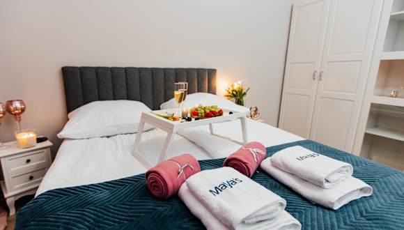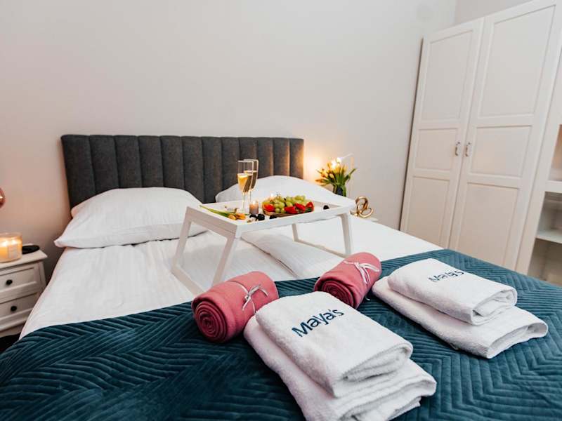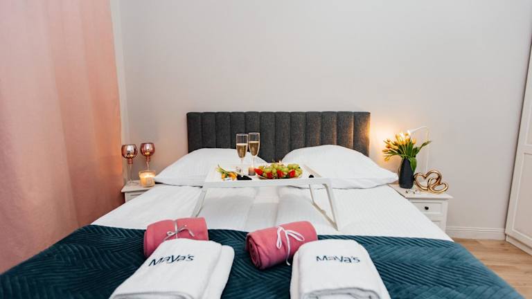 Maya's Flats & Resorts 59 - Most Miłości bietet eine Ferienwohnung mit Balkon, einem Schlafzimmer, einem Wohnzimmer und einer gut ausgestatteten Küche. Die Unterkunft ist hell und einladend gestaltet.