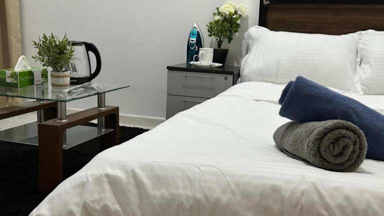 Die Unterkunft MBZ - New Fabulous Room in Unique Flat bietet klimatisierte Zimmer und ein geteiltes Badezimmer. Die Ausstattung umfasst eine rund um die Uhr besetzte Rezeption, die Arabisch und Englisch spricht, sowie eine Vielzahl von Dienstleistungen, darunter Zimmerservice, Währungsumtausch und eine Gemeinschaftsküche. Haustiere sind nicht gestattet.