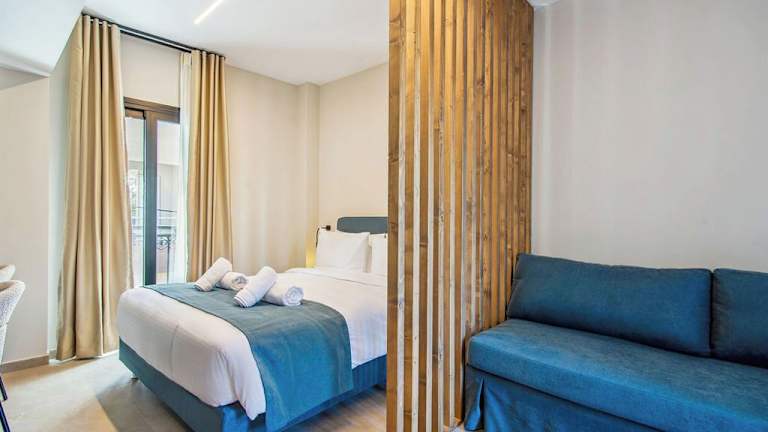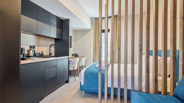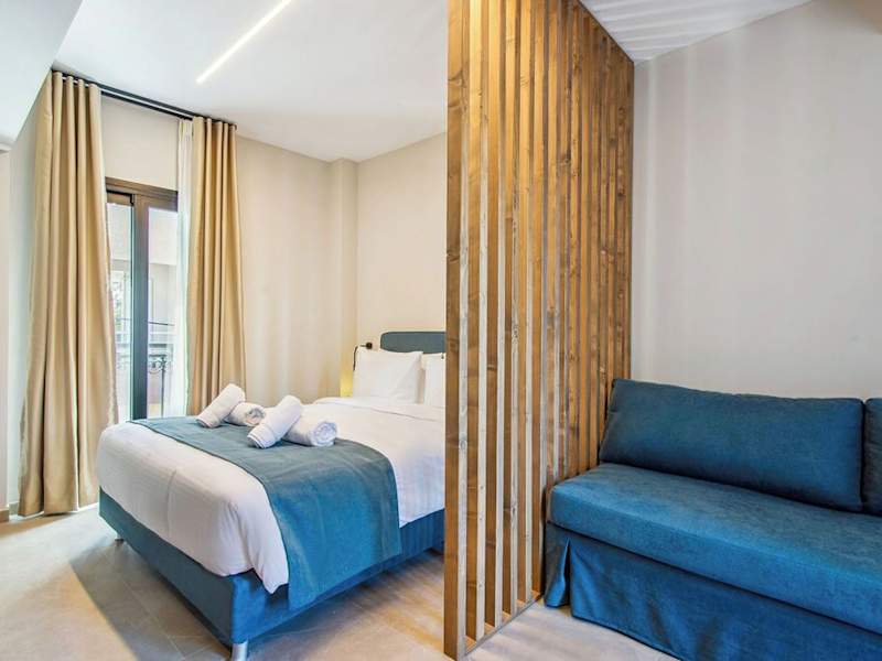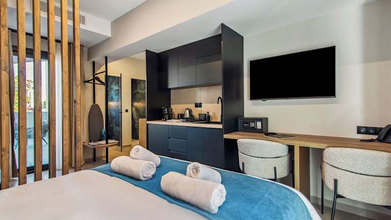 Jede Wohneinheit ist mit einer voll ausgestatteten Küchenzeile, einem Esstisch, einem Flachbild-TV mit Satellitenkanälen und einem eigenen Badezimmer ausgestattet. Einige Wohneinheiten verfügen über eine Terrasse oder einen Balkon mit Stadt- oder Bergblick. Die Zimmer sind schallisoliert, klimatisiert und bieten moderne Annehmlichkeiten wie einen Safe und Handdesinfektionsmittel. Tägliche Reinigung ist ebenfalls inkludiert.