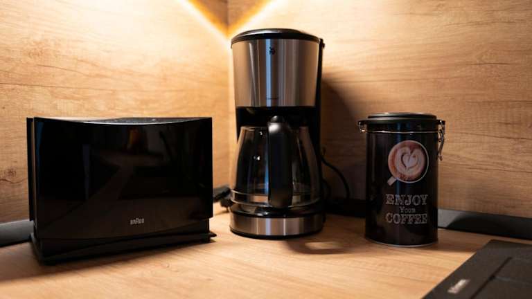 Das Angebot umfasst ein Café vor Ort mit der Möglichkeit der Essenslieferung in die Unterkunft. Speisen für spezielle Ernährungsbedürfnisse sind auf Anfrage verfügbar.