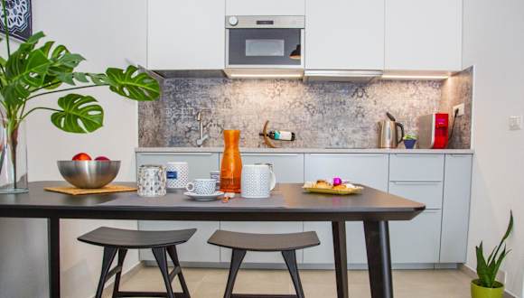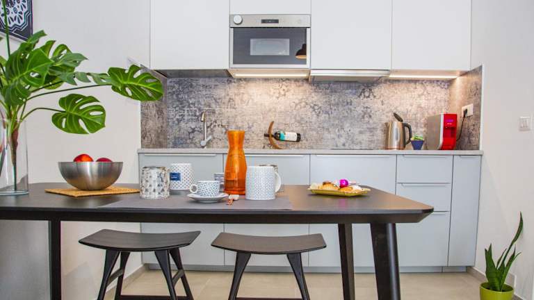 Die Ferienwohnung verfügt über eine voll ausgestattete Küche mit Kühlschrank und Kaffeemaschine. Es sind keine spezifischen Informationen zu Verpflegungsmöglichkeiten vorhanden.