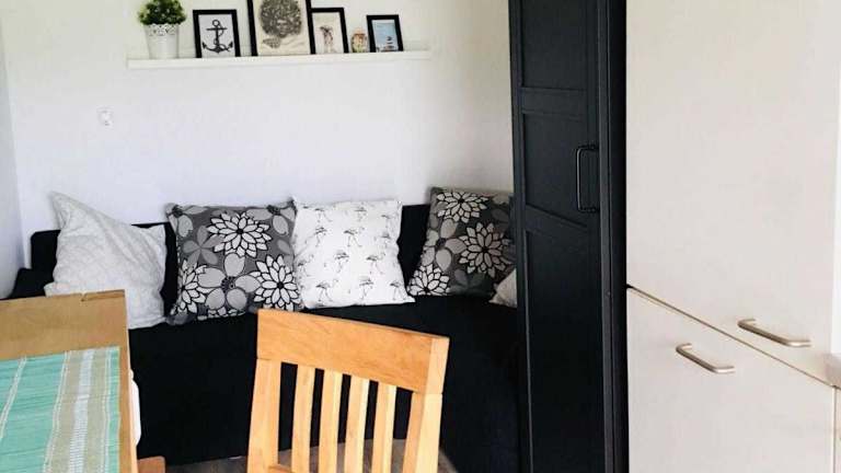 Die Unterkunft besteht aus einem separaten Schlafzimmer, einem Wohnzimmer sowie einer voll ausgestatteten Küchenzeile mit Kühlschrank und Geschirrspüler. Ein Badezimmer mit Handtüchern und Bettwäsche gehört ebenfalls zur Ausstattung.
