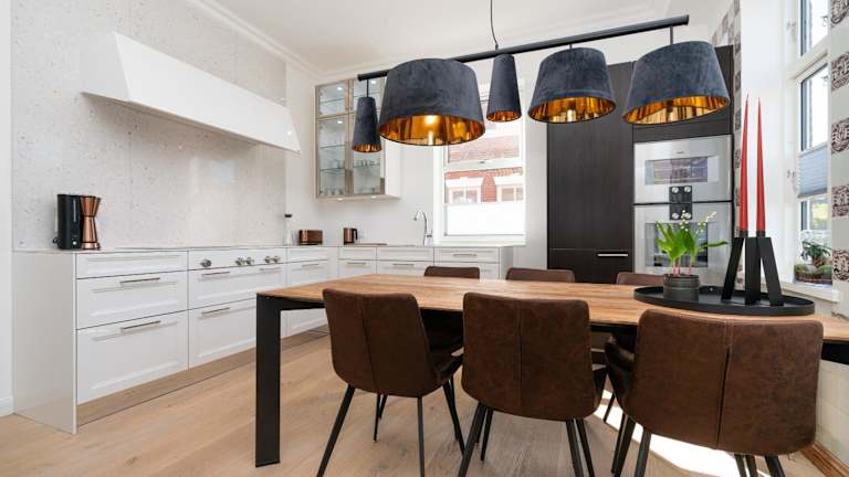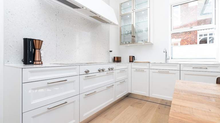 Eine gut ausgestattete Küche mit Kühlschrank, Geschirrspüler, Ofen, Mikrowelle, Herdplatte, Toaster, Kaffeemaschine und Wasserkocher ermöglicht die Zubereitung eigener Mahlzeiten. Es sind jedoch keine Informationen zu weiteren Verpflegungsmöglichkeiten vorhanden.