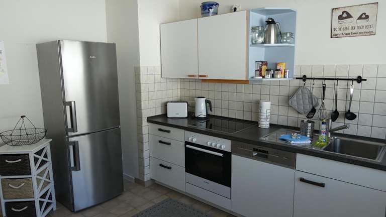 Die Unterkunft verfügt über zwei Schlafzimmer, ein Wohnzimmer mit einem TV, der Satellitenkanäle empfängt, sowie eine voll ausgestattete Küche. Diese umfasst einen Kühlschrank, Geschirrspüler, Waschmaschine, Ofen und Herdplatte, was den Gästen eine autonome Selbstverpflegung ermöglicht.