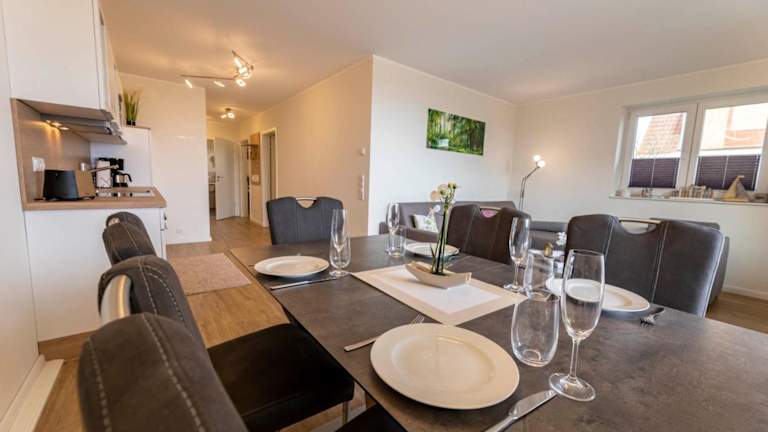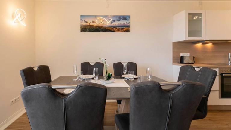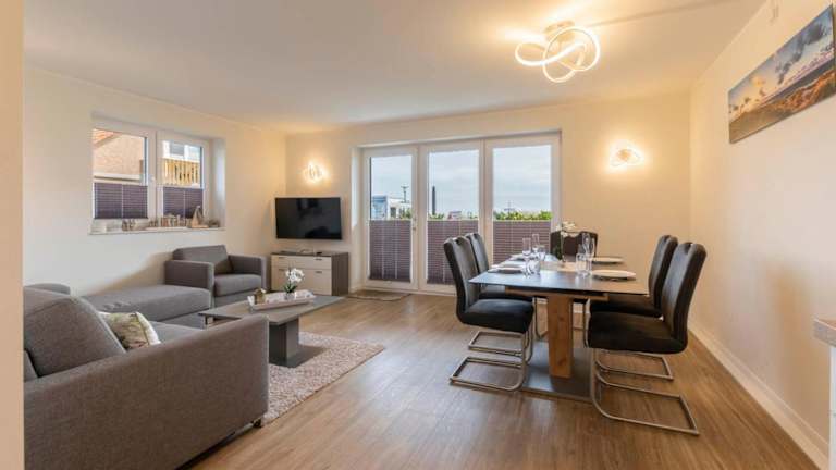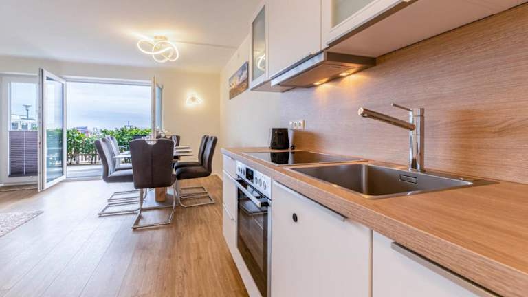 Die Ferienwohnung im Erdgeschoss bietet zwei Schlafzimmer und ist mit einem Fernseher sowie einer voll ausgestatteten Küche ausgestattet. Zur Küchenausstattung gehören ein Kühlschrank, Geschirrspüler, Waschmaschine, Ofen und Mikrowelle, die den Gästen alle nötigen Annehmlichkeiten für einen angenehmen Aufenthalt bieten.